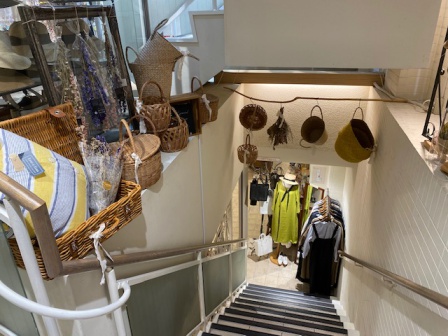 地下フロアへ降りる階段にもマルシェかごかごや収納かごがお出迎えしております。