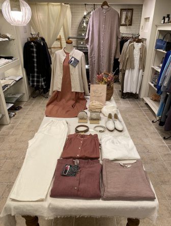 地下フロアに降りてすぐ、目に入るピンクでコーディネートされたお洋服たちです。ピンクといっても生地によって色や形もさまざま。