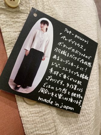 気温に合わせて、ペレグブラウスを羽織ってみるのも存在感があって素敵です☆