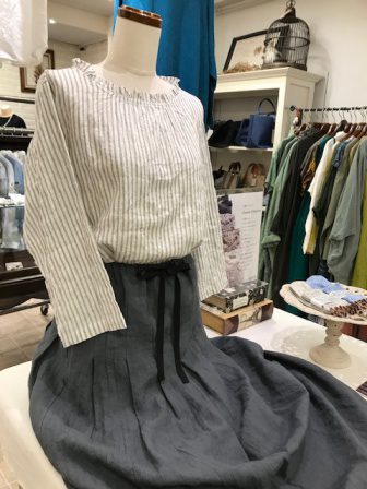 スロンスクエアのブラウスとスカートを色違いでコーディネートしてみました。こちらは、襟元のフリルが華やかなブラウスです。後ろにひとつボタンで留めるようになっているところも可愛いです。とーっても肌触りの良い素材で、ナチュラルな風合いです。スカートのリボンがアクセントになります◎