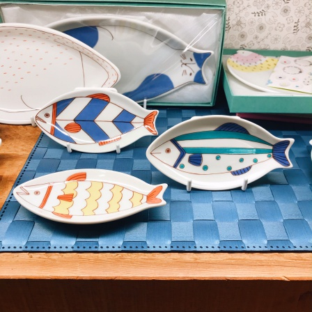 こちらもおさかなモチーフの小皿です♪そのまま飾っておいてもインテリアとして使えそうですね~。よく見ると魚の表情が種類ごとに違っていて、クスッと笑ってしまうかわいさです(^^)
