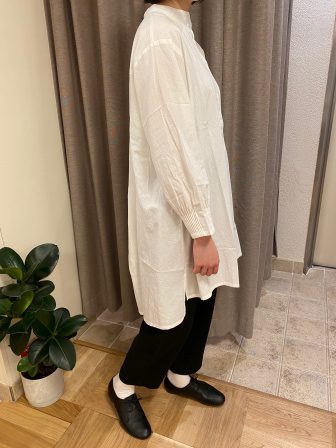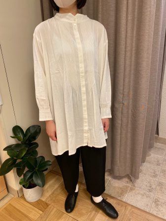 こんにちは!地下フロアスタッフの尾崎でございます。季節の移り変わりのこの時期に、ぴったりのお洋服をご紹介いたします。イノブン四条本店地下スタッフも着用している、秋の新作、綿麻素材のタックチュニックです。