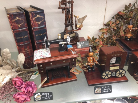 蓄音機やピアノ、廻している姿が可愛い小人や本物のような足踏ミシンなど