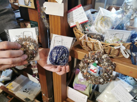 梶谷:そうですね、クリスマスリースのキットがあります。手編みで作るの簡単で、お子様も作れるぐらい簡単に楽しんでいただけるのでおすすめです。中にリース用のワイヤーが入ってるんですけど、ヘアゴムを代わりに入れるとシュシュにもなるんです。