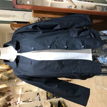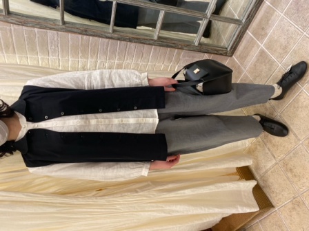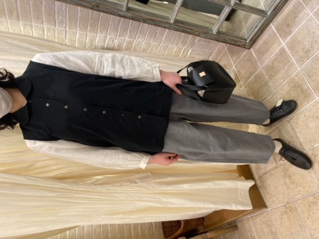丸襟といえば、こちらも。後ろにリボンのついたノースリーブブラウスです。お色は、ブラック、前には、きらきらと美しい貝ボタンがついています。写真のように、白いブラウスの上に前のボタンを留めずに、羽織ると、縦長のラインが強調されて、すらっとした印象になります。パンツスタイルにおすすめの1着です。