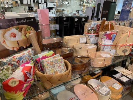 河崎:人気があるのは、やっぱりわっぱのお弁当箱ですね。それはこちらにあります。木のわっぱもずっとお取り扱いしているんですが、わっぱ風なのも最近良く出ています。電子レンジや食洗機が使えるので。一緒に置いている風呂敷も人気ですね。お弁当包みにちょうどいいんです。あとおにぎりケースですね。