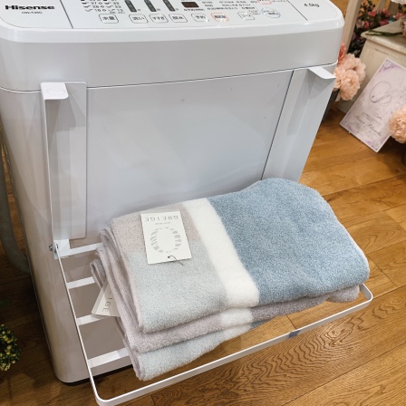 洗濯機にマグネットで接着して、タオルなどが仮置きできる折りたたみラック。