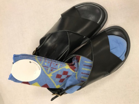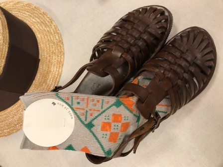 皆様、こんにちは。イノブン四条本店地下フロアでございます。気温がぐ~んと上がりましたね。熱中症にお気をつけて、夏のお出かけをお楽しみいただきたいなと思います。今回は、サンダルに合うカラフルなソックスをご紹介いたします。