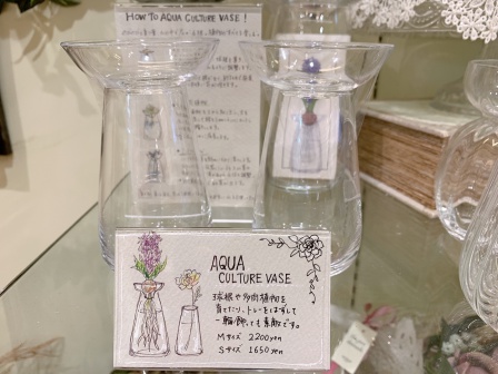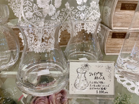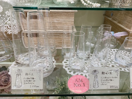 ガラスのフラワーベースが並んで、なんとなく涼しい雰囲気ただよう3階の売り場。他にも大きめのフラワーベースや、ガラスの小物入れなどをご用意しています。