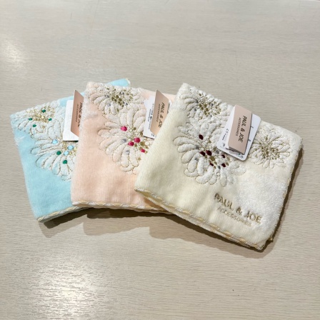 まずは、PAUL&JOEのタオルハンカチ。ふわふわで肌触りが良く、ゴールドの刺繍がおしゃれです。シンプルなデザインなので、贈り物としても人気です。