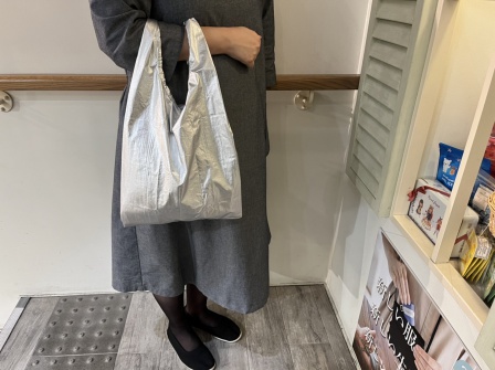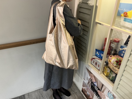 このメタリックカラーのエコバッグ、当店のスタッフの間でも大人気なんです。キラキラのデザインは思わず目が引かれてしまいますよね☆