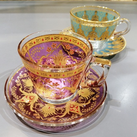 異国情緒あふれるガラスのカップ&ソーサー。トルコの職人によって、全てハンドメイドで装飾が施されています。繊細で美しい柄のティーカップは、ティータイムを華やかに演出してくれます♪