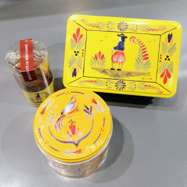 ブルターニュ地方の新鮮なバターや天然塩をたっぷりと使い、こだわりの伝統的なレシピで作り上げられたビスケットは、上品かつ素朴な味わいです。黄色い缶には、民族衣装をまとった男女や美しい花、青い鳥など、この地方の伝統的な「カンペール陶器」の絵柄が描かれています。