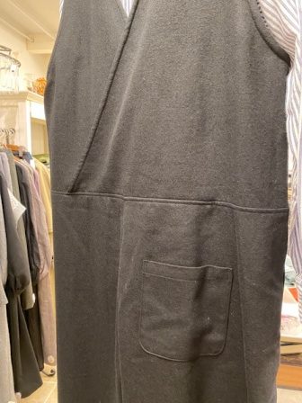こちらのサロペットは、バックスタイルが素敵なんです!生地のブイの重なりと可愛いポケットの配置が魅力的です。