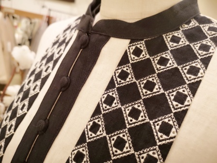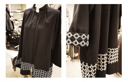 羽織としても着て頂けるロングシャツで、裾の切り替えと袖口見返しが刺繍生地になっているのがポイント。