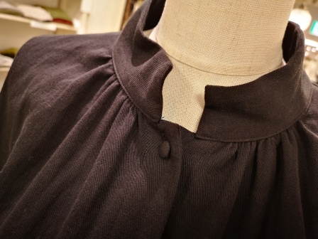 少し高さのあるスタンドカラーで首元はシャープな印象になっており、前衿ぐりにはギャザーと後ろにはボックスタックが入っているので立体感もあり、上品な一着となっております。