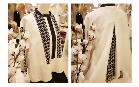前身頃と袖、後身頃にあるボックスタックからちらりと見える刺繍生地で華やかな印象になります。