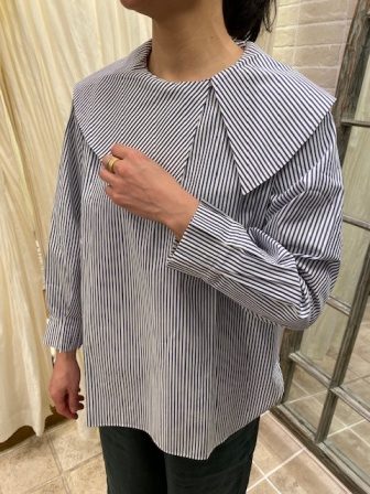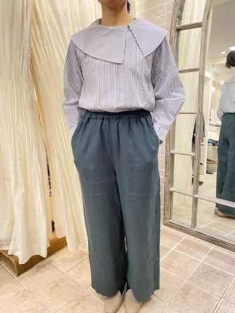 コーディネートしたこちらのブラウス、シンプルなパンツとの相性も◎少し大胆な衿のデザインが魅力的です。