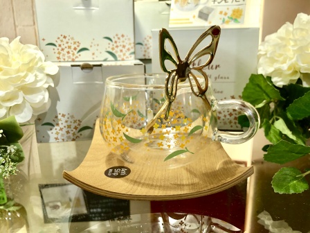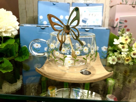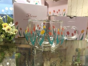 そんなお花が綺麗なこの時期にぴったりなお花をモチーフにしたグラスをただいま2階階段前にてピックアップしております。