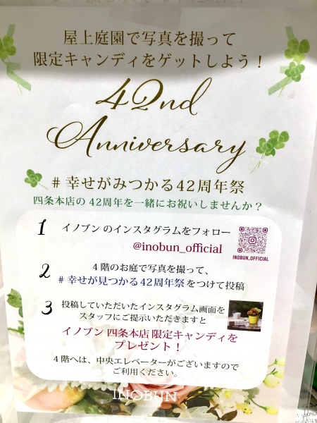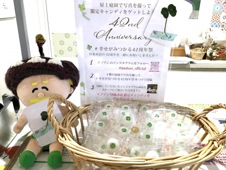 イノブンのインスタグラムアカウントをフォローしていただき、4階のお庭で写真を撮って #幸せがみつかる42周年祭 をつけて投稿していただきますと四つ葉のクローバー🍀のキャンディーをプレゼントいたします✨