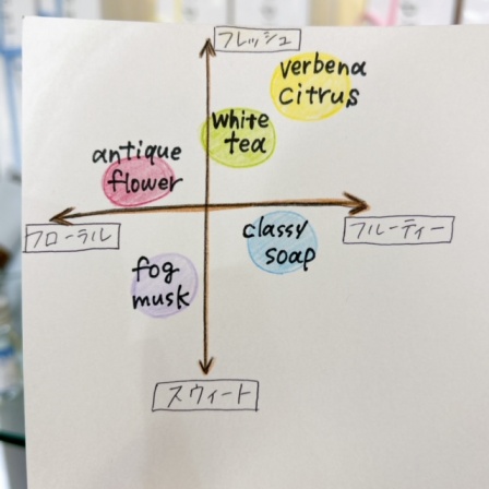 トップノートはベルガモットや洋梨、ミドルで紅茶やレモングラス・ゼラニウム、ラストノートはすずらん、ホワイトムスクが香ります。