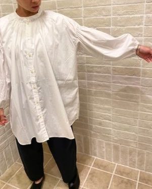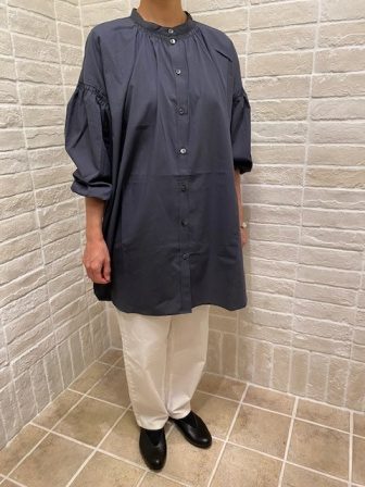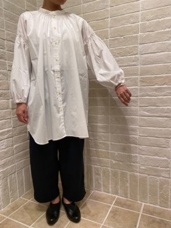 ホワイトカラーもシンプルながら、細やかなシャーリングデザインがひきたちますね♪ベストと合わせても◎羽織としてコーディネートして頂くのも素敵です。