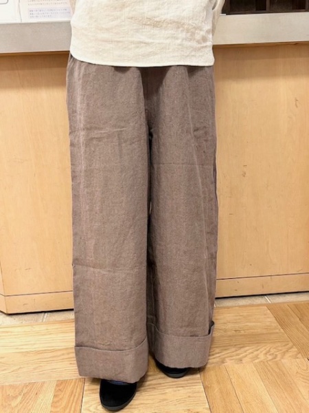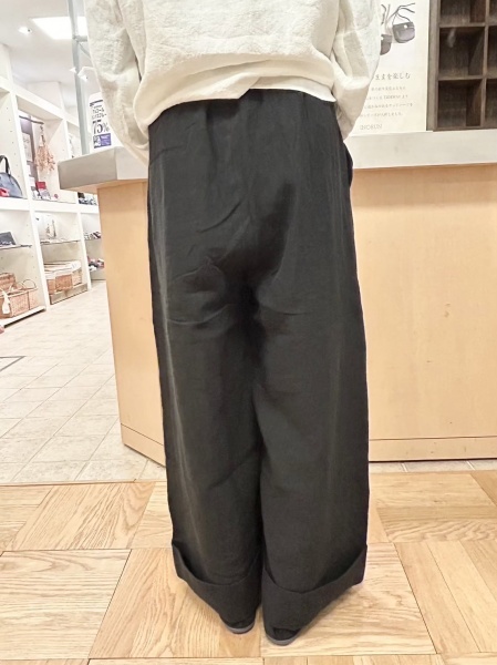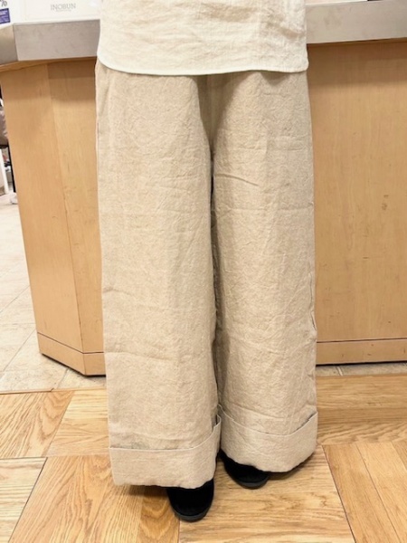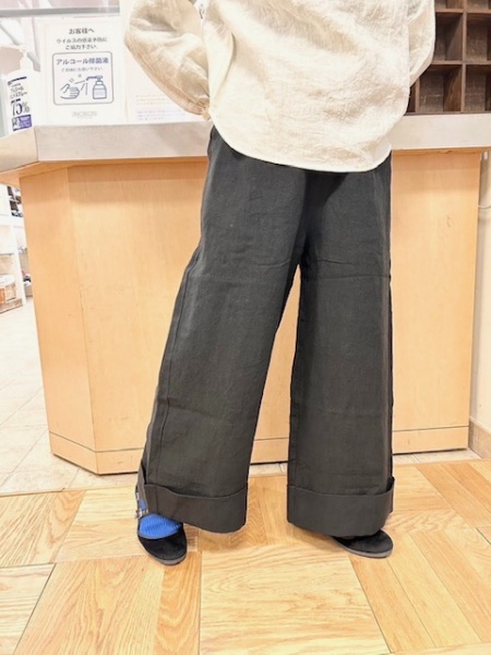 今回、地下フロアからご紹介するのは、ファンの多い、made in Kyotoのお洋服ブランド スロンスクエアより、「ベルギーリネン 裾ダブルワイドパンツ」です。