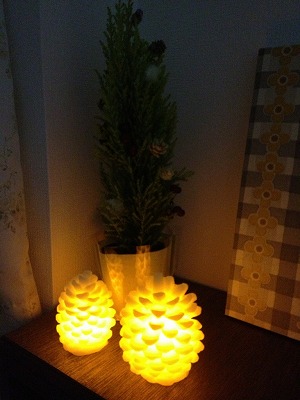 この松ぼっくりのLEDキャンドル、中にLEDの電球が埋め込まれていて、本物のキャンドルのようにゆらゆら光ってとってもきれいなんです。