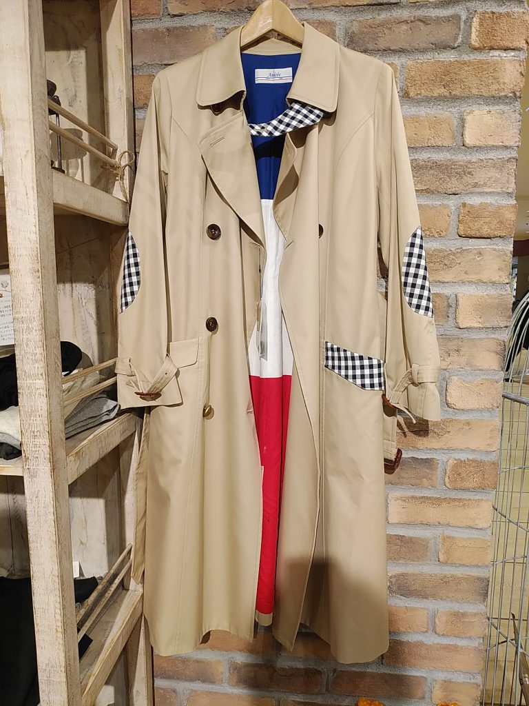 定番アイテムのトレンチコートは、裏地のトリコロールや部分的なチェック生地がアクセントになっています。
