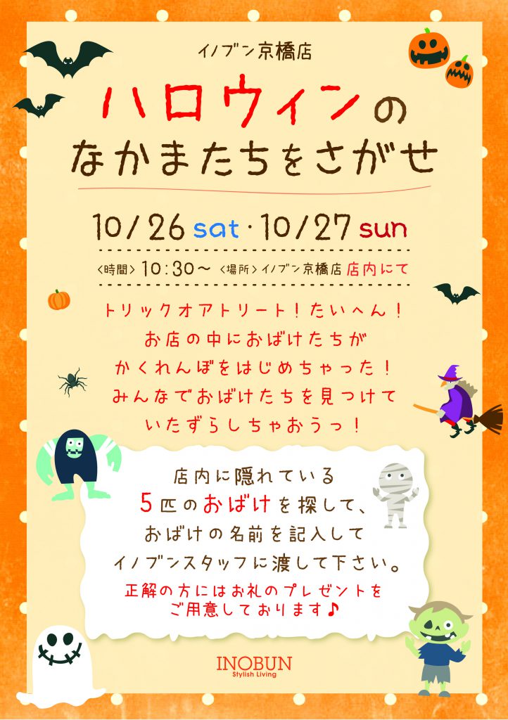 イノブン京橋店では、10月26日(土)・10月27日(日)に「ハロウィンのなかまをさがせ」のイベントを行いま。