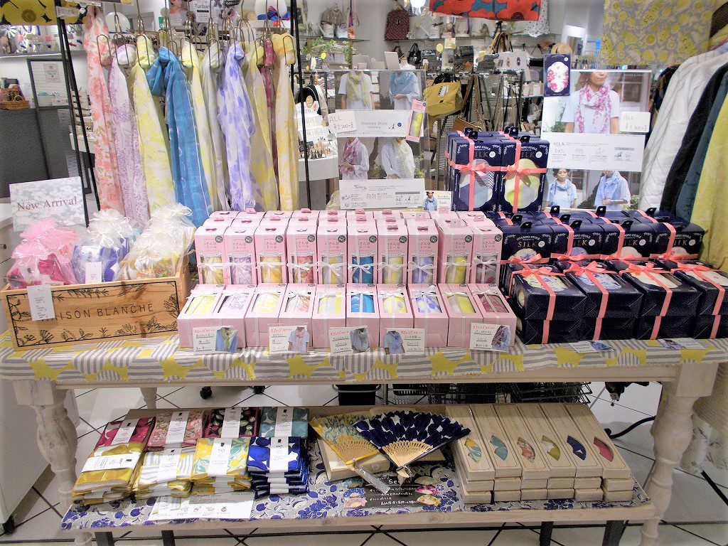 下段画像…右下 蚕のシルクを使用したストールは、4柄ご用意しております。