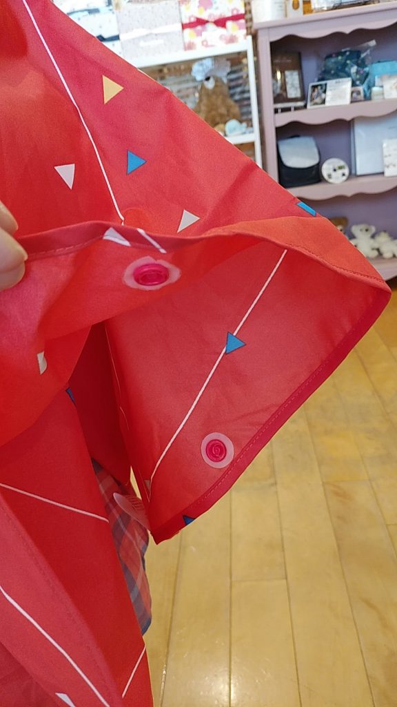 ちなみに腕周りのカバー問題ですが、ポンチョの内側にスナップボタンが付いていて、これを留めることで袖代わりになります↓