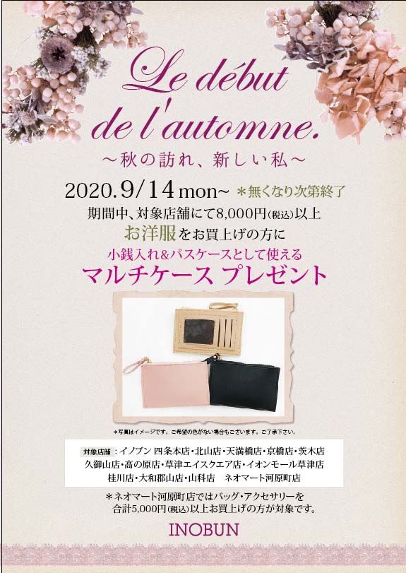 9月14日(月)より、イノブンの対象店舗でお洋服を8,000円(税込)以上お買い上げ(ネオマート河原町店のみバッグ・アクセサリーを合計税込み5,000円以上となります)の方にマルチケースをプレゼントいたします。 小銭入れ&パスケースとして使える、可愛くて便利なマルチケースです。