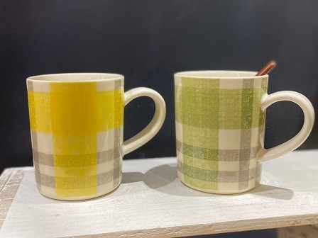 銅板転写と呼ばれる技法で施された、生地の織り目までもリアルなリネンチェック柄のマグカップ。たっぷりのカフェオレやミルクティに。こちらはオーブンも対応なのでスープやパイを使ってポットパイなんてのも♪