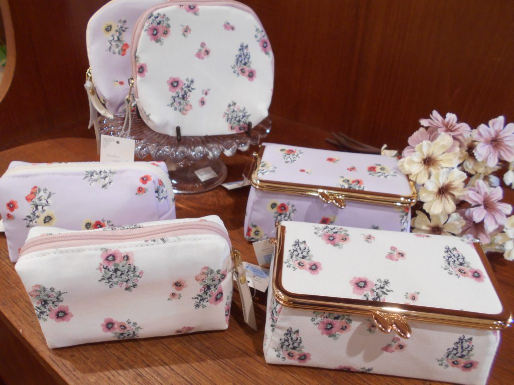 小さめのお花が可愛らしいこちらのポーチは、春前から販売しており人気の商品です!優しい色目のパープルと、フチがピンクのホワイトとの2種類です。