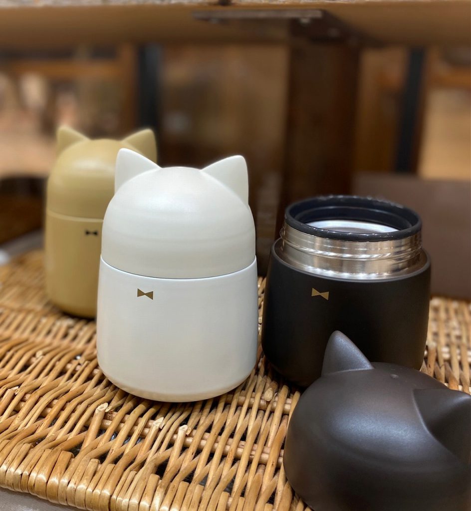 にゃんこのカタチのスープポット。かわいらしいフォルムながら落ち着いたカラーリングが大人の女性にも使いやすいポットです。安定感のある末広がりの形に蓋の耳の部分が開閉しやすく見た目の可愛さだけでなく、機能性も◎