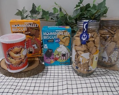 夏のデザインはコミックス「ムーミン、海へいく」のお話に登場するキャラクターたちが船の甲板にいる様子が描かれています。ビスケットはムーミンの物語にしばしば登場し、北欧に数多く自生しているこけもも(リンゴンベリー)味です。フィンランド産のこけももを使用しています。