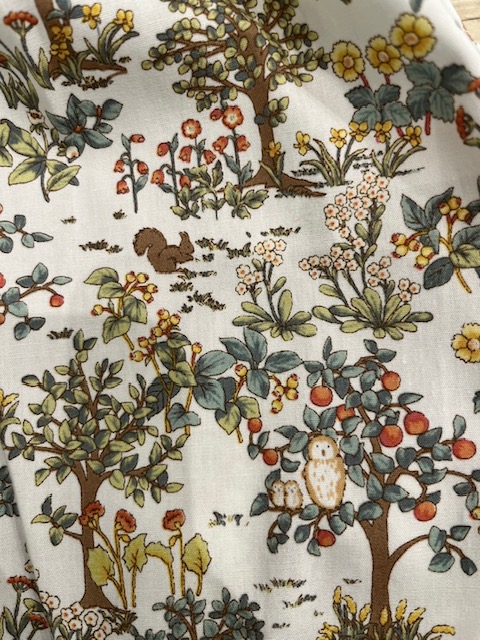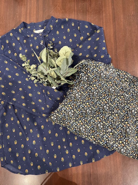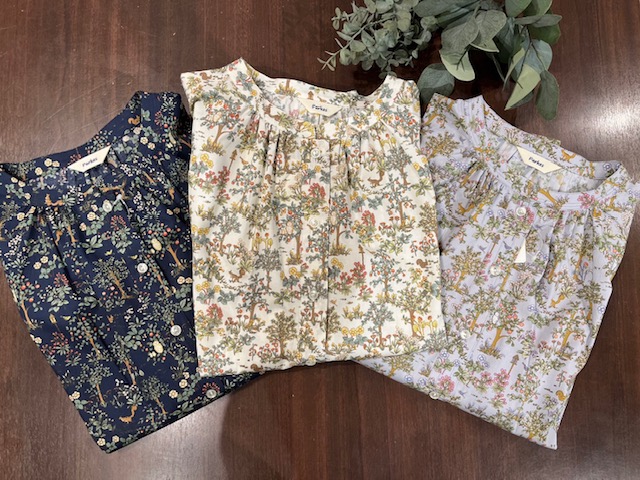 お花が咲き、木の実がなる森で一緒に暮らす小動物たちが描かれたブラウスです。スタンドカラーで使いやすく、春先にはベストと合わせるのがオススメです。