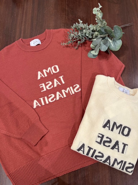 優しい色合いのロゴニットですが、文字を反転させてみると、、なんと!ローマ字で❝オマタセシマシタ❞という文字に!