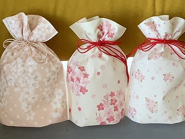 桜柄の包装紙や巾着でラッピングしたものを、