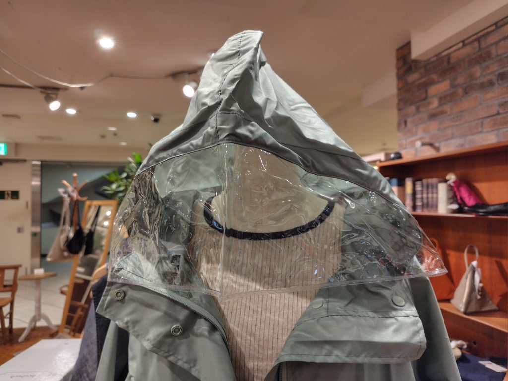 すっぽりかぶっても全面部分が透明なので、顔をフードで隠しつつも前が見える!