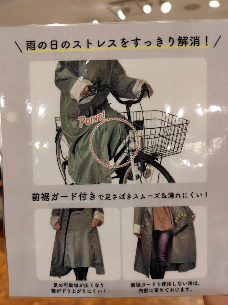 一見ふつうのどこにでもあるレインコートに見えますが・・・実は、自転車に乗るときにありがたい細かい工夫がいっぱいなんです!