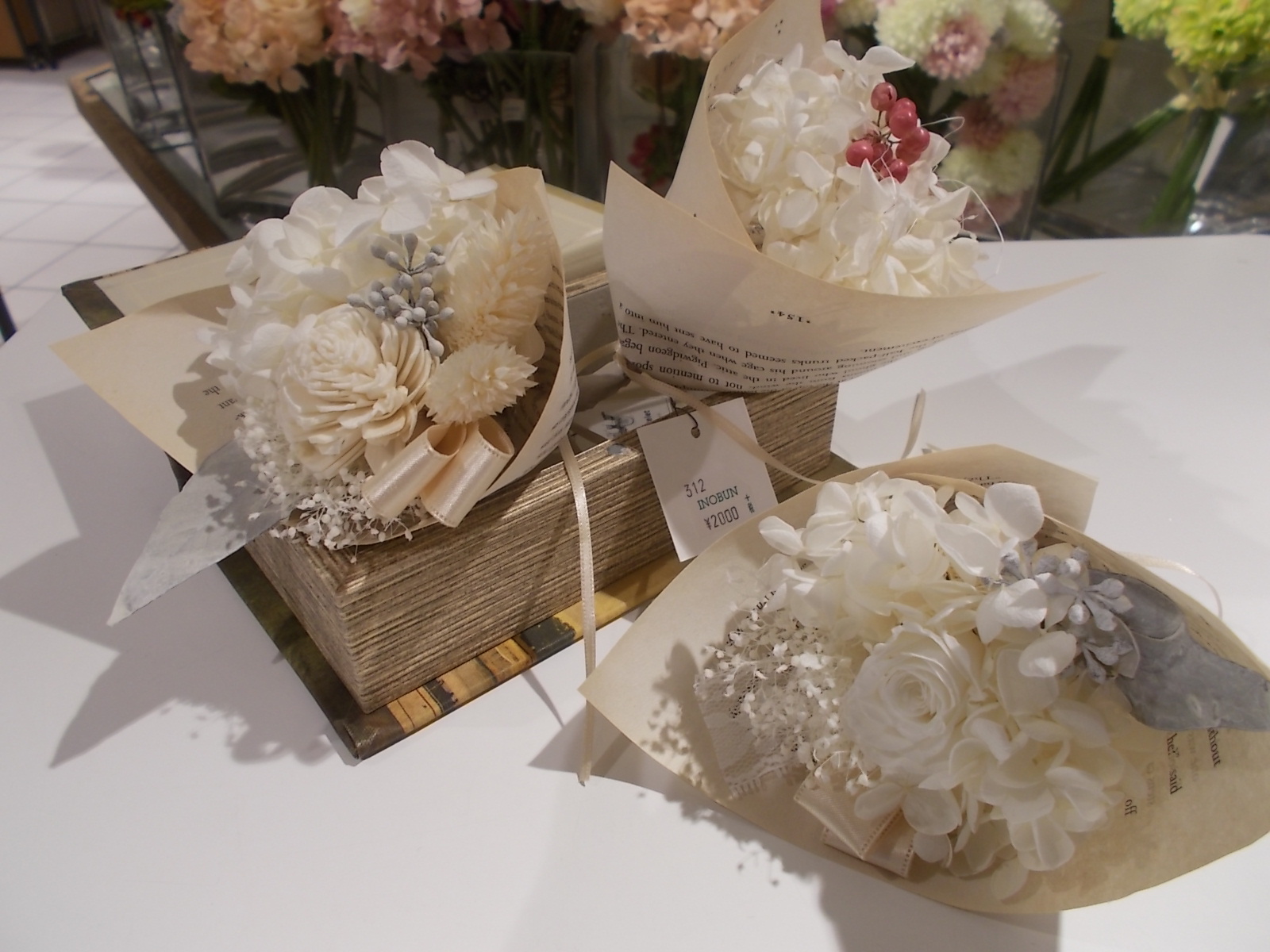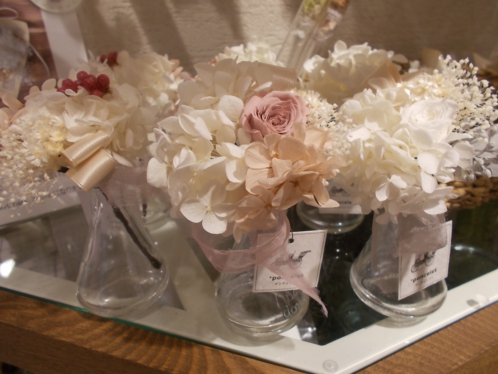 大人かわいいミニブーケ。飾り棚に置いたり、テーブルで楽しんだり、小瓶に挿していただくこともできます。後列左のブーケのソーラーフラワーはアロマオイルをつけることが出来るので、お好きな香りを楽しんでいただくこともできます。