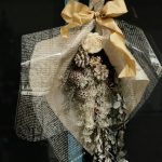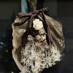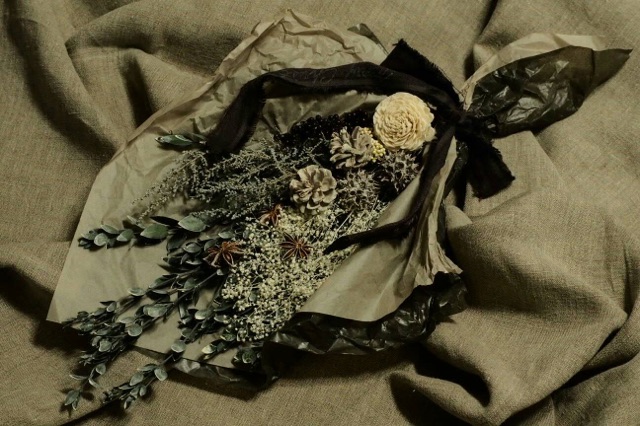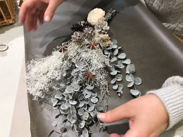 今回はユーカリと松ぼっくり、様々なドライフラワーを使用しました。