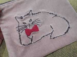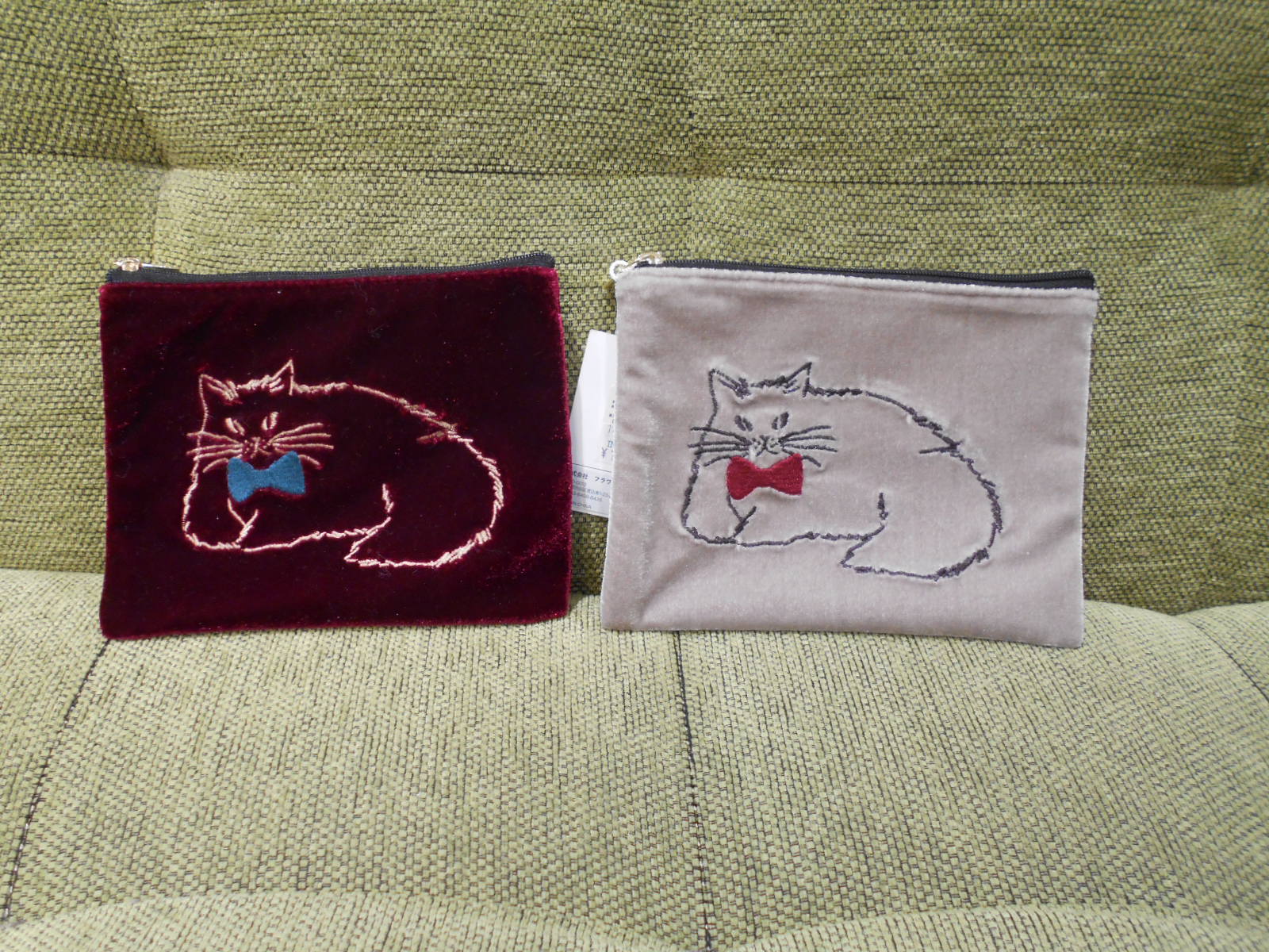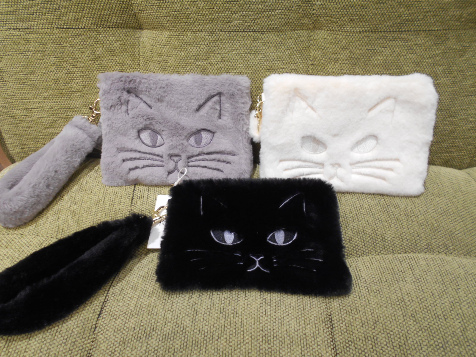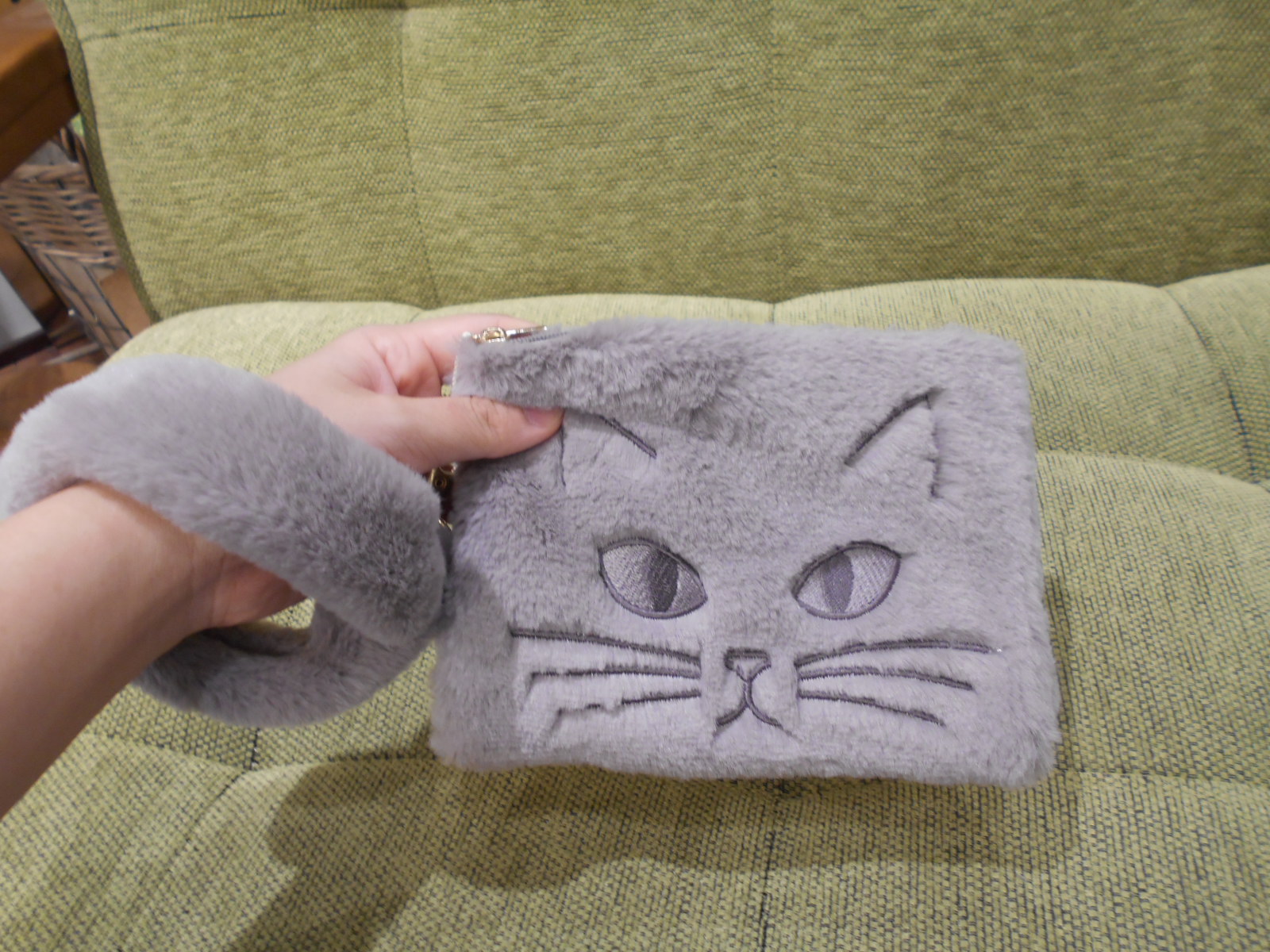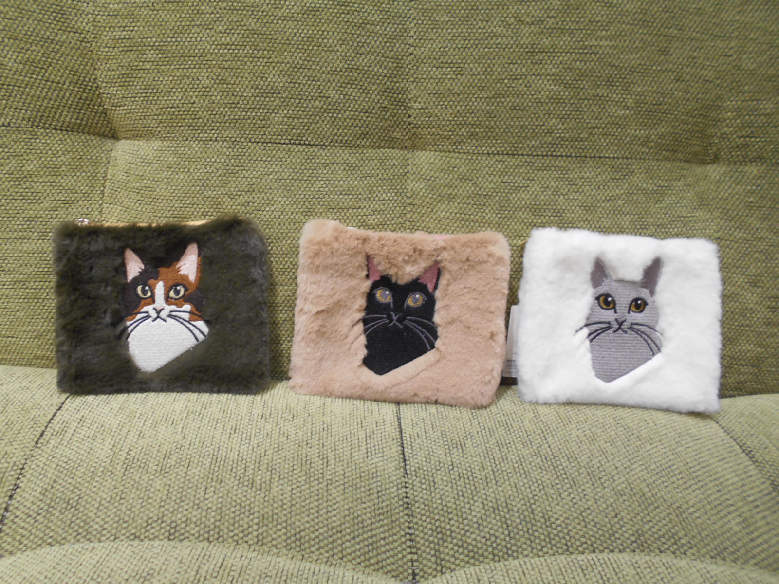 ファー生地にねこの刺繍がデザインされたポーチです!