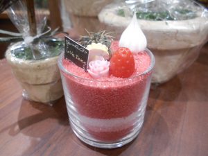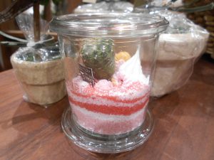 ガラス瓶にカラー砂とサボテンを入れて、その上にスイーツデコレーションをトッピングしていきます。