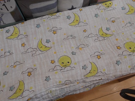 今はお気に入りのオモチャ代わりにしていまして、フワフワ感が気持ちいいのか、よくこのおくるみを握りしめたり噛んだりしています!