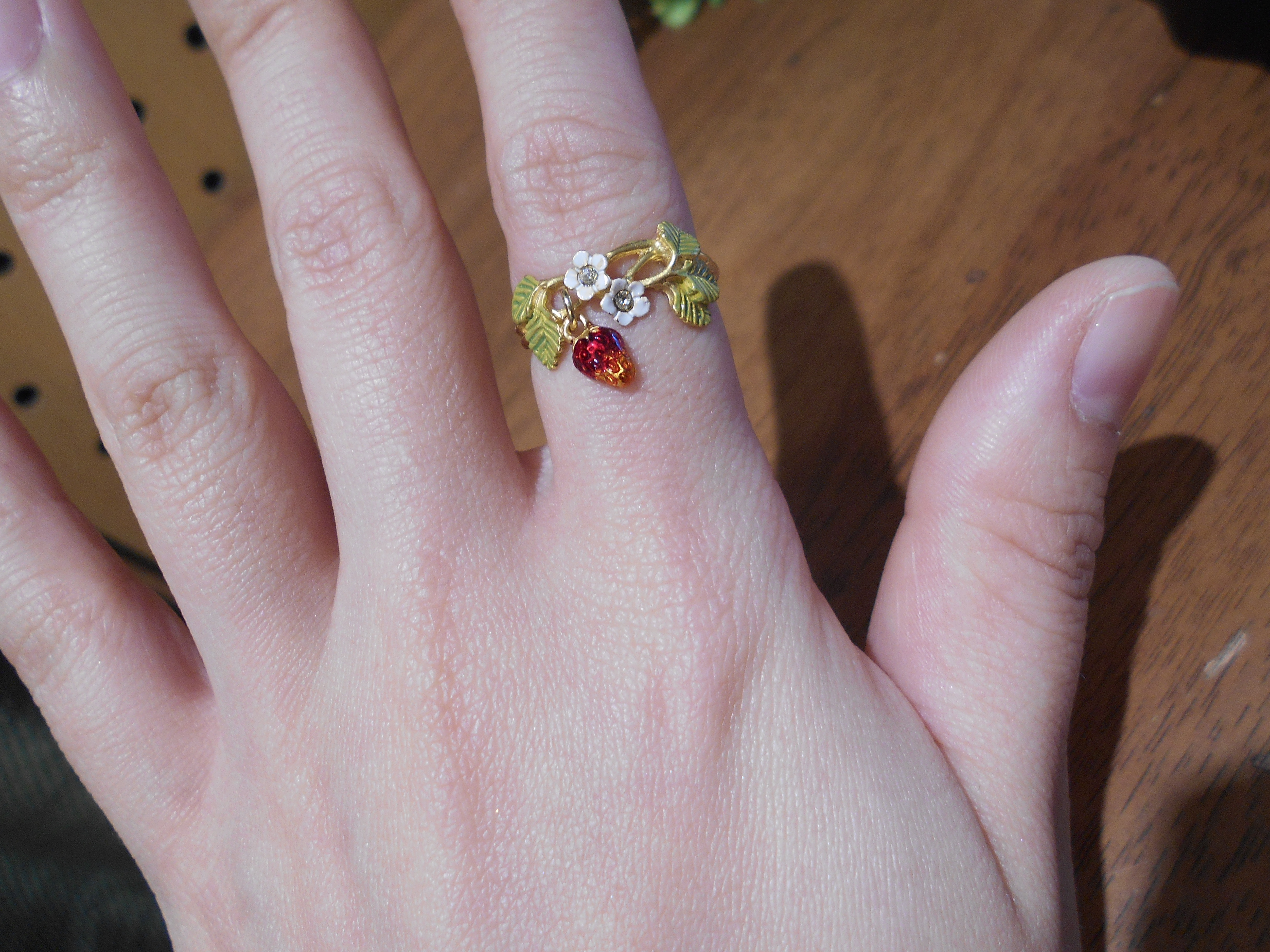 いちご畑の中にいちごの実が出来ているようなデザインのリングです(*^^*)