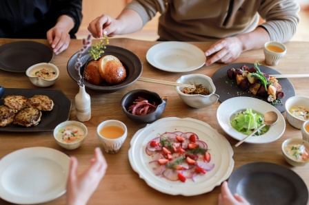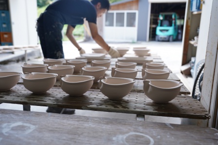 独自にブレンドした鉄分の多い赤土に、白泥を掛け低温で二回の本焼きをする事で「白」の柔らかな粉引きの器が産まれ、そしてどんな料理でも優しく包みこむ器は、日々の料理と向き合う時間を優しいものにしてくれます。