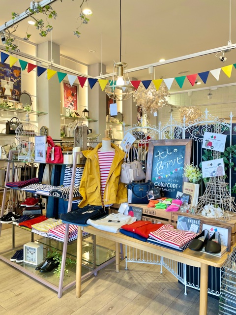 只今服飾入り口側売り場にて、「大人の色アソビ」をテーマに色とりどりのお洋服を取り揃えております。
